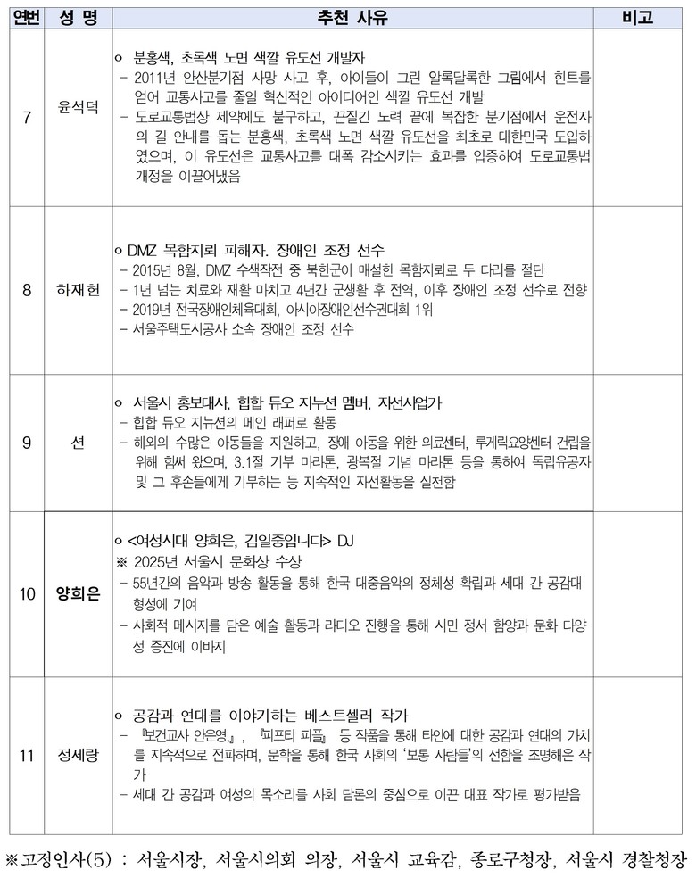 새해를 알리는 33번의 타종에는 올 한 해 우리 사회에서 다양한 희망을 전한 시민 영웅들이 참여한다. ‘25년간 생명의 전화 상담을 이어온’ 김귀선 씨, ‘등굣길 학생들에게 무료로 빵을 나누어주는’ 김쌍식 씨, ‘15년간 도시락 배달봉사를 진행한’ 이복단 씨 등 다양한 선행을 펼쳐온 시민들이 타종에 참여한다. 또한 ‘지속적인 자선활동으로 선한 영향력을 끼치는’ 가수 션과 ‘한국 대중음악의 산증인’ 가수 양희은, ‘공감과 연대에 대해 이야기하는’ 작가 정세랑 씨 등 사회 각계각층을 대표하는 인사들도 함께하여 총 11명의 타종인사가 시민들과 함께 새해를 맞이한다.