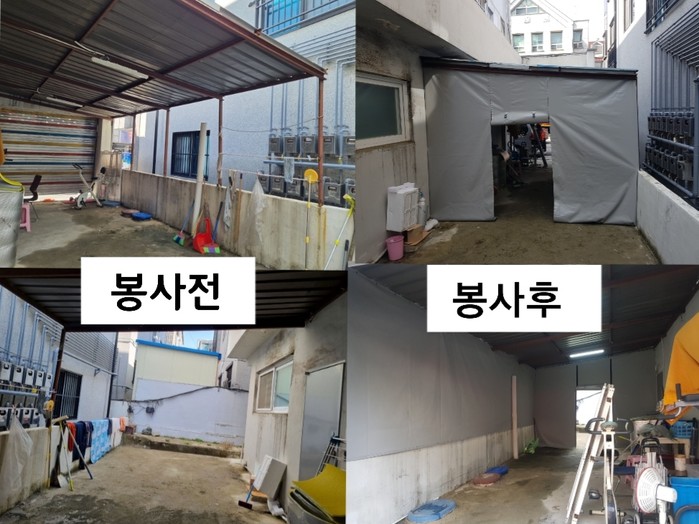 이날 봉사에는 천정훈 단장을 비롯해서 박준영 안성호 유희자 회원들이 1층 주차장 공간에 천막을 설치 하였다.