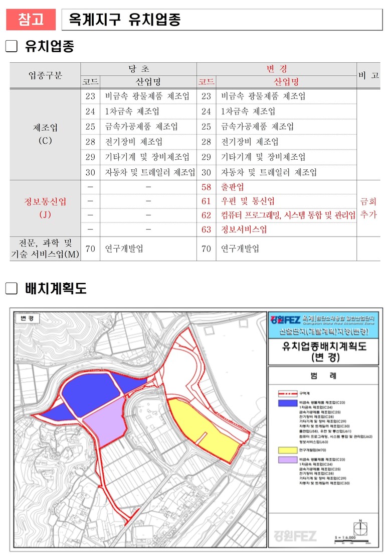 강원경제자유구역청은 다양한 첨단산업의 입주 촉진을 위해 업종 특례지구로 지정된 구역에 대해 12월 23일 경제자유구역 개발계획 변경을 추진하여 유치 업종을 기존 7개에서 11개로 확대했다.