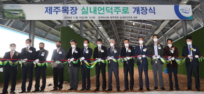 한국마사회 제주목장은 오는 19일 실내언덕주로 개장식을 열고 본격적인 운영에 돌입한다. 제주목장 실내언덕주로는 총 면적 14만㎡에 860미터의 실내주로와 526미터의 진입로로 구성된 경주마 육성훈련시설로 지난 7월 개장한 장수목장 실내언덕주로에 이어 두 번째로 완공돼 국내 최고 수준의 시설을 완비했다. 금일 개장식에는 김낙순 한국마사회장을 비롯해 안동우 제주시장 등이 참석해 실내언덕주로의 첫 걸음을 축하하며 자리를 빛냈다.