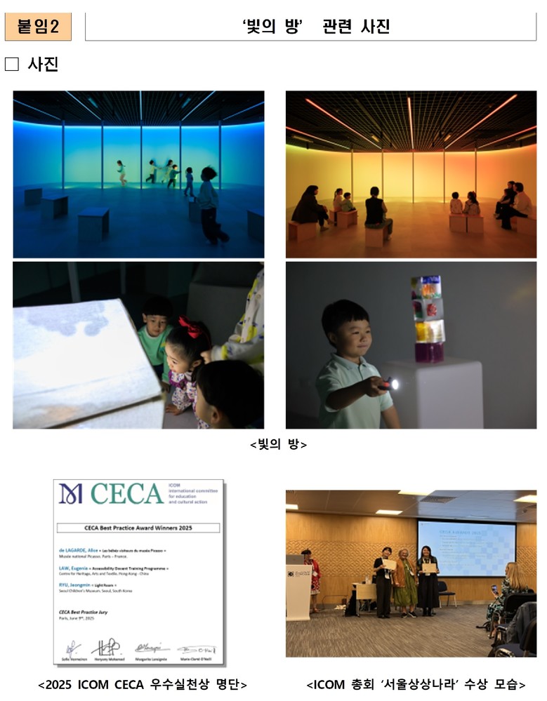 교육 분야에서도 의미 있는 성과가 있었다. 감성예술교육 공간 ‘빛의 방’이 혁신성과 우수성을 인정받아 2025 ICOM CECA 우수실천상(Best Practice Award)을 수상했다. 이번 수상은 한국 박물관으로는 두 번째, 한국 어린이박물관으로는 최초 수상으로 특별한 의미가 크다.