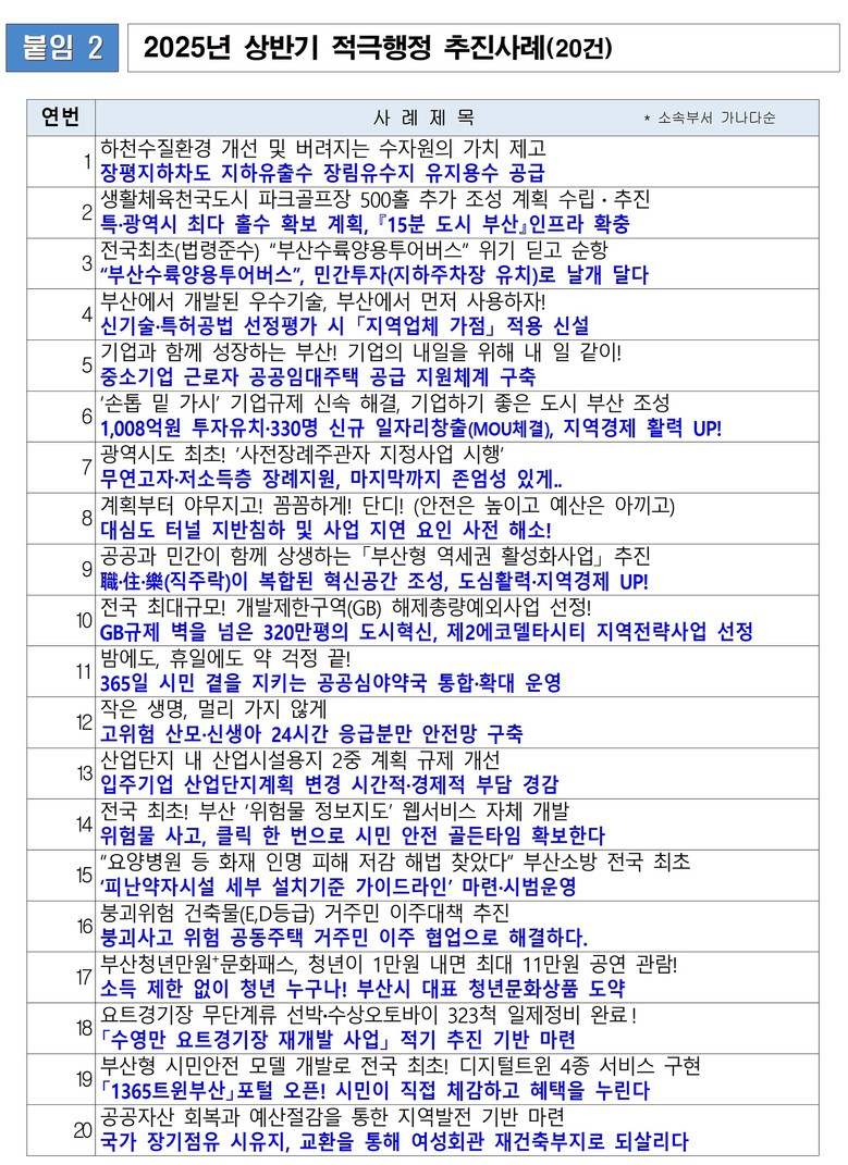 ** 전국 최초 지하차도 비상대피로 설치 표준안 수립 및 대피시설 설치로 전국 표준이 되다!(시 도로계획과), 노후 열수송배관 개선으로 4만 5천 세대 9년 민원 한 방에 해결했다(부산환경공단)