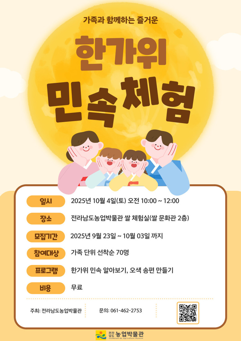 ‘한가위 민속 체험행사’는 가족 단위로 선착순 70명을 모집한다. 참가 신청은 농업박물관 누리집에서 10월 3일까지 접수하며, 참가비는 무료다.