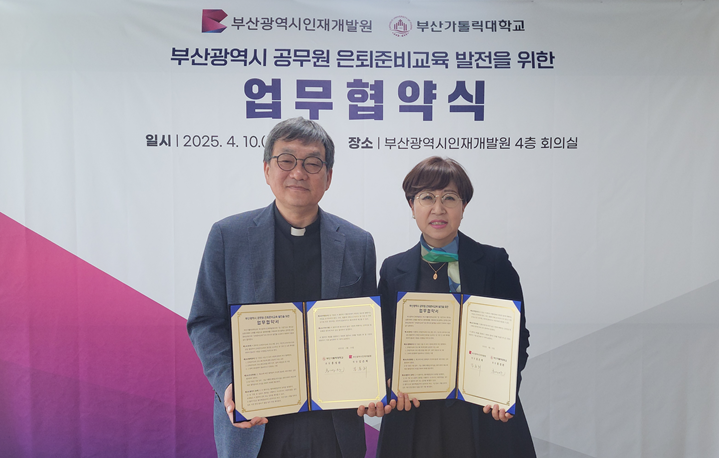 [부산 세계타임즈=이용우 기자] 부산광역시인재개발원(원장 김은희)은 부산가톨릭대학교(총장 홍경완)과 어제(10일) 시 인재개발원에서 『부산시 공무원 은퇴준비 교육 발전을 위한 업무협약(MOU)』을 체결했다고 밝혔다.