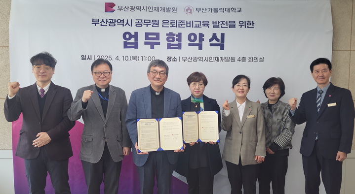 이번 협약은 공무원들의 은퇴 후 삶에 대한 체계적인 준비를 지원하기 위해 마련됐으며, 김은희 시 인재개발원장, 홍경완 부산가톨릭대학교 총장 등이 참석했다.