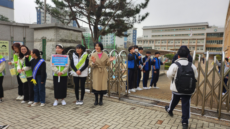 [시흥시 세계타임즈=송민수 기자] 지난 29일, 시흥능곡중학교(교장 임애숙) 학부모회는 간접흡연 예방 등 금연환경 조성을 위해 ‘학교 흡연예방 및 금연실천 캠페인’을 전개했다.