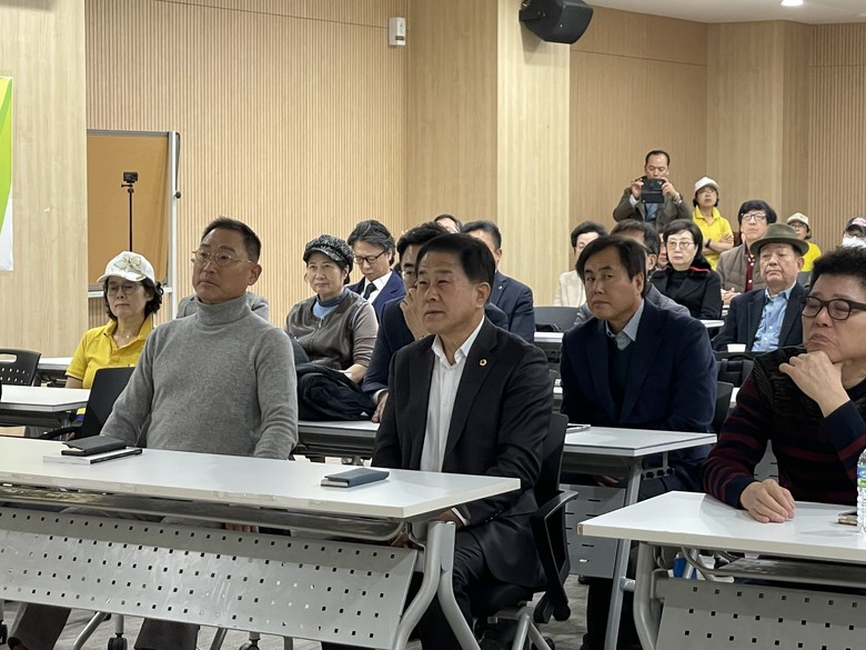 ▲ 지난 11월 21일 서울시의회 별관 제2대회의실에서 열린 ‘하이컨디션-UN본부행사 및 월드컵응원전 준비조직위원회 발대식’에 참석한 김용호 서울시의원(앞줄 중앙)이 강연을 듣고 있다.