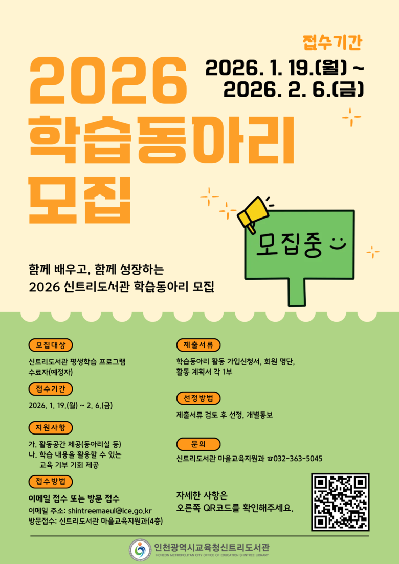 자세한 사항은 신트리도서관 누리집을 확인하거나 마을교육지원과(☎032-363-5045)로 문의하면 된다.