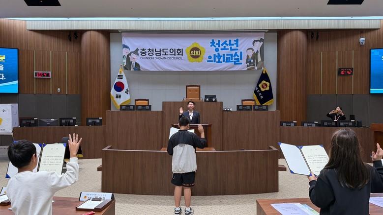 [천안시 세계타임즈=백택기 기자] 충남도의회(의장 홍성현)는 11일 천안 위례초등학교 학생 27명과 지도교사 3명이 참여한 가운데 ‘청소년 의회교실’을 열었다.