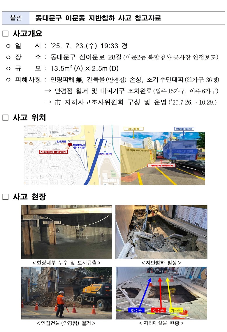 이 사고는 7월 23일 19시 33분경 동대문구 신이문로 28길 굴착공사장 인접 보도에서 발생한 면적 13.5㎡, 깊이 2.5m의 지반침하 사고로, 인명피해는 없었으나 인접 건물 1개소가 철거되는 물적 피해가 발생했다.