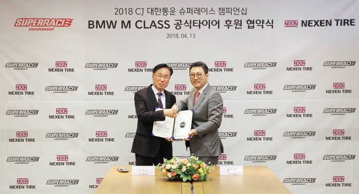 [ 세계타임즈 김인수 기자 ] 2018 CJ대한통운 슈퍼레이스 챔피언십이 넥센타이어의 후원을 받는다. 김준호 ㈜슈퍼레이스 대표와 조명국 넥센타이어 상품기획담당 전무는 13일 서울시 중구 CJ제일제당센터에서 후원 협약식을 가졌다. 이번 후원 협약을 통해 넥센타이어는 슈퍼레이스 챔피언십의 신설 클래스인 BMW M Class에 앞으로 3년간 ‘엔페라 SUR4G’ 타이어를 공급하게 됐다.