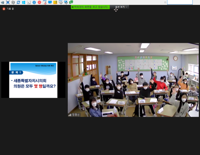 이번 의회교실은 세종시의회 본회의장과 현재 등교 수업 중인 으뜸초등학교 6학년 교실을 화상회의 프로그램으로 연결하여 현장감을 높였으며, 의회 홍보 동영상 시청과 의회‧으뜸초등학교와 관련한 퀴즈풀이, 학생들이 직접 시 의원이 되어 회의를 진행하는 ‘모의 본회의’ 순으로 이뤄졌다.