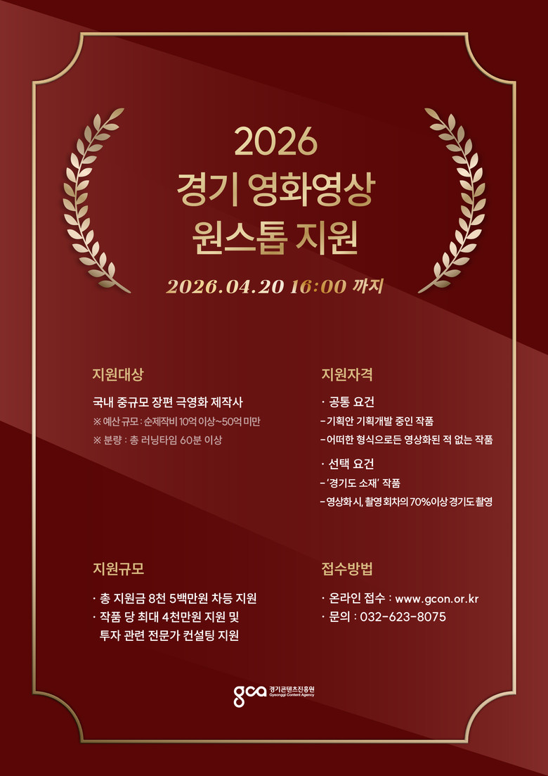 공모 접수는 오는 4월 20일 오후 4시까지 온라인으로 진행된다. 자세한 내용은 경콘진 누리집 내 사업 공고 게시판에서 확인할 수 있으며 관련 문의는 영상산업팀으로 하면 된다.