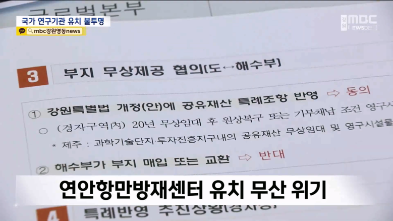 당초 강원경제자유구역청 측에서 강릉 옥계면 일대의 부지를 해양수산부에 제공(무상 임대)하고 그 부지에 연구센터를 지으려는 계획이었는데, 부지가 법률상 ‘공유재산’인 것이 문제가 되었다.