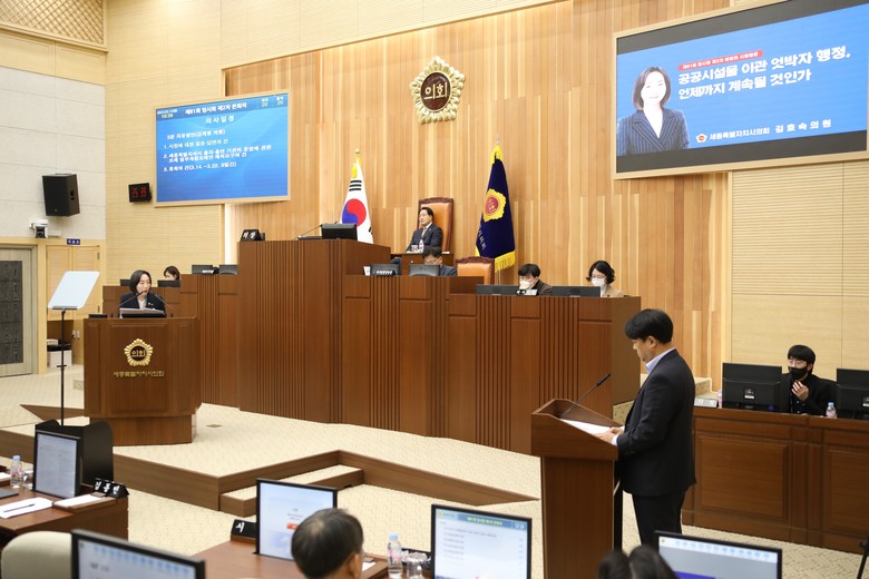 이날 시정질문에서는 세종특별자치시 이준배 경제부시장과 고성진 미래전략본부장을 대상으로 세종시의 공공시설물 인수 관련 정책 방향과 대응 상황에 대한 질문이 이어졌다.