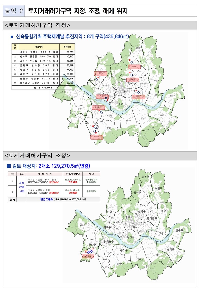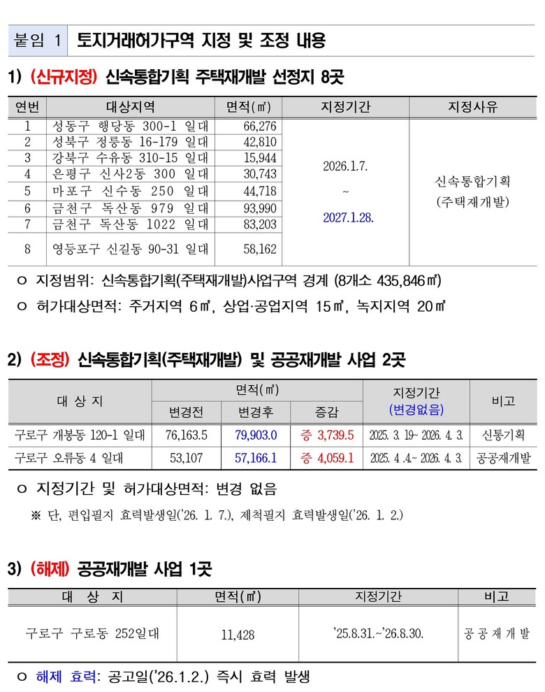 아울러 기존 신속통합기획 주택재개발 선정지 1곳 및 공공재개발 선정지 1곳은 사업구역 변경 경계에 맞춰 토지거래허가구역을 조정했다. 대상지는 구로구 개봉동 120-1 일대 및 오류동 4 일대이며, 허가대상 면적 및 지정기간은 기존과 동일하게 유지된다.