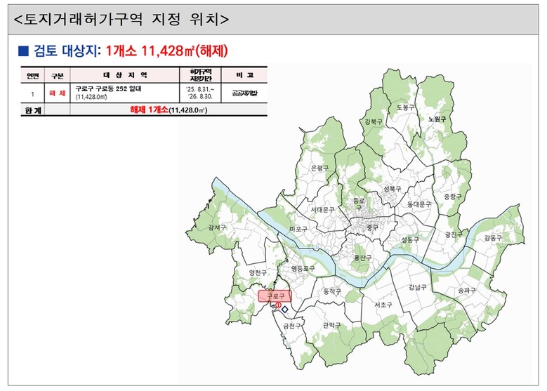 또한, 당초 지정사유가 소멸된 구로구 구로동 252 일대 공공재개발사업 후보지 1곳에 대하여 토지거래허가구역을 해제한다.