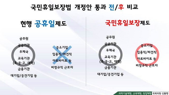 이에 신 의원이 발의한 ‘국민의 휴일에 관한 법률’은 국민의 휴식권 보장 및 삶의 질 향상을 위해 명절, 국경일 등 국가적으로 기념하고 경사스러운 날을 모든 국민의 휴일로 지정했다.