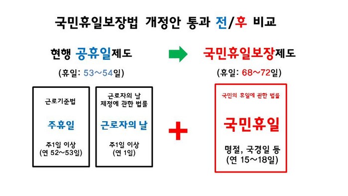 또 정부가 ‘국민휴일(연간 15~18일)’을 법정공휴일로 지정하는 한편, 근로기준법상 근로자의 휴일로 보장하도록 함으로써, 사용자는 ‘주휴일’, ‘근로자의날’과 함께 ‘국민휴일’도 사업장내의 휴일로 지정해 근로자의 휴일을 보장토록 했다.