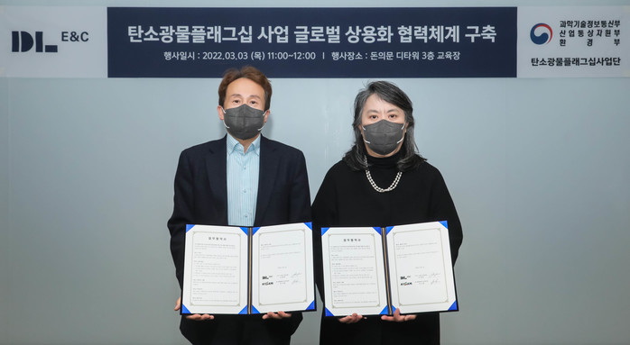 DL이앤씨는 3일 종로구 평동 D타워 돈의문 사옥에서 한국지질자원연구원 탄소광물플래그십 사업단과 '탄소광물화 원천기술 글로벌 상용화 협력체계 구축'을 위한 업무협약을 체결했다. 협약식에는 유재형 DL이앤씨 CCUS담당임원과 안지환 한국지질자원연구원 탄소광물플래그십 사업단장이 참석했다. 양측은 CCUS 연구개발 성과물의 상용화를 통해서 신사업 모델을 개발할 계획이다.