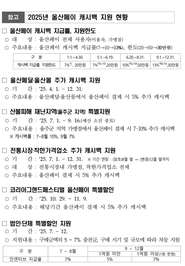 또한 지역소비 활성화와 소상공인 지원을 위해 울산페이 적립금(캐시백) 비율 및 월 한도를 연초 7%, 20만 원에서 6월 20일부터 10%, 50만 원, 9월부터는 13%, 30만 원으로 확대했다. 착한가격업소와 전통시장 내 울산페이 가맹점 이용 시 5% 추가 환급 혜택, 산불 특별재난지역으로 지정된 울주군 지역의 7 ~ 10% 특별지원, 코리아그랜드페스티벌 기간 5% 특별할인 등 총 279억 원의 울산페이 발행 예산을 확보해 소비를 적극 유도했다.