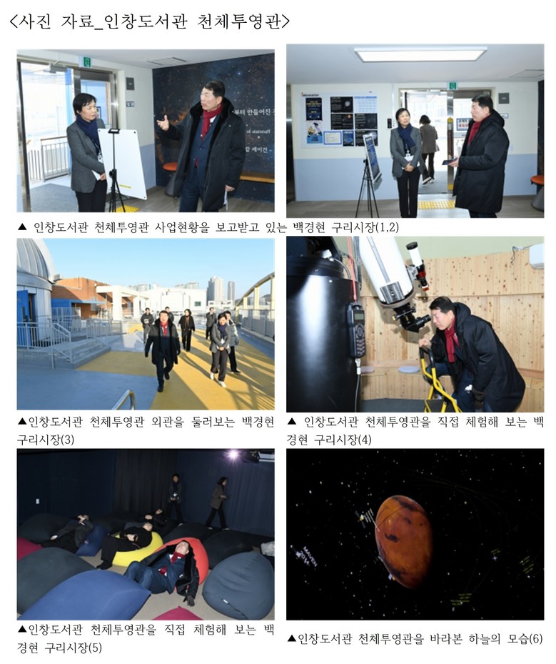 [구리시 세계타임즈=송민수 기자] 구리시(시장 백경현)는 27일 오후 3시 30분, 수택3동에 있는 수택건강생활지원센터와 인창도서관 천체투영관 방문해 시설 운영 준비 상황과 향후 운영계획을 점검했다.