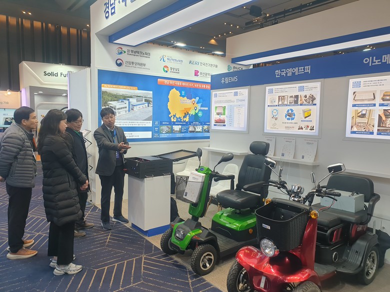 경남 지역 기업은 △(주)씨티알에너지의 충전 크래들과 테슬라 셀 재사용 스와핑 배터리 △(주)씨티엔에스의 재사용 배터리 적용 UPS △(주)이노메카닉스의 친환경 리차저블 스마트 4륜 전동스쿠터를, 부산 지역은 △삼세산업(주)의 캠핑카용 ESS △(주)우림EMS의 조타장비 △(주)한국엘에프피의 전동 휠체어·배터리를 전시한다.