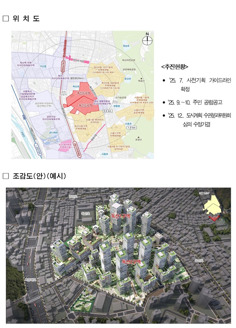 - 용도지역 상향 및 사업성 보정계수 등 반영으로 공공성과 사업성 높여 [서울 세계타임즈=이장성 기자] 서울시는 2025년 12월 24일(수) 「제14차 도시계획위원회 신속통합기획 정비사업 등 수권분과위원회」를 개최하여 ‘독산동 1036일대(이하 독산1구역)’과 ‘독산동 1072 일대(이하 독산2구역)’ 주택정비형 재개발사업 정비구역 지정 및 정비계획 결정(안)을 '수정가결' 했다고 밝혔다.