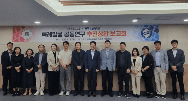 [강원도 세계타임즈=김민석 기자] 강원특별자치도(도지사 김진태)는 9월 19일(금) 오전 10시 강원특별자치도민회관 대회의실에서 전북특별자치도와 함께 「특례 발굴 공동연구 추진상황 보고회」를 개최했다고 밝혔다.