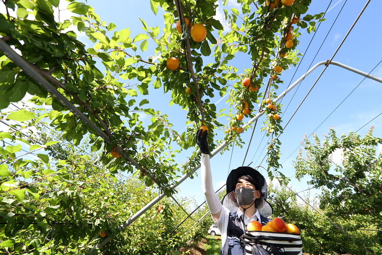 [전주=세계타임즈 = 최준필 기자] 소서인 7일 전북 완주군 이서면 농촌진흥청 국립원예특작과학원 시험 재배지에서 연구원들이 자두와 살구를 교잡해 만든 플럼코트 ‘심포니’ 품종을 수확하고 있다. 2012년부터 보급을 시작한 국내 육성 플럼코트는 2012년 20ha에서 2021년 약 200ha로 10년 새 재배면적이 10배가량 확대되었다.