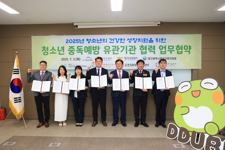 이번 협약은 수성구청 주최로 수성경찰서, 대구광역시 동부교육지원청, 대구도박문제예방치유센터, 한국마약퇴치운동본부 대구지부, 한국지능정보사회진흥원 대구스마트쉼센터, 대구수성구정신건강복지센터, 수성구청소년상담복지센터 등 청소년 중독과 관련된 전문기관들이 참여한 가운데 진행됐다.