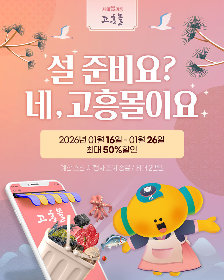 이번 기획전은 설을 앞두고 가정에서 필요한 명절 장보기 수요에 맞춘 행사로, 제수 준비와 명절 식탁에 활용되는 농수특산 식재료를 합리적인 가격에 제공하기 위해 기획됐다. 행사 기간 동안 고흥몰 입점 상품을 대상으로 최대 50% 할인 혜택이 적용된다.