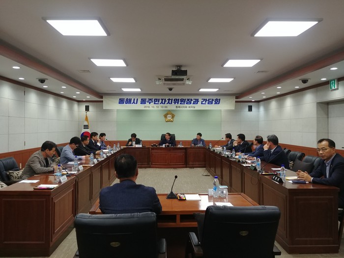 [동해시=세계타임즈 김민석 기자] 동해시의회(의장 최석찬)는 2018년 10월 10일 10시 동해시의회 회의실에서 동해시주민자치위원장협의회(회장 이정운)와 간담회를 개최하여 각동의 현안 및 애로사항을 청취하는 시간을 가졌다.