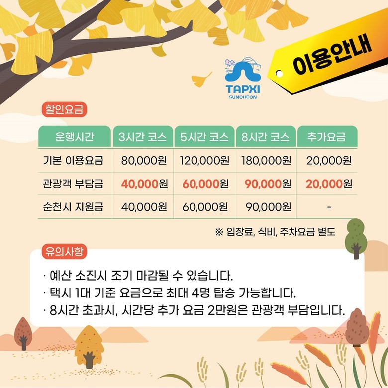 시 관계자는 “이번 가을맞이 관광택시 반값 이벤트가 보다 더 많은 관광객들이 순천을 찾는 계기가 되길 바란다”며, “가을빛으로 물든 순천의 다채로운 풍경 속에서 편안하고 특별한 시간을 보낼 수 있기를 바란다”고 전했다.