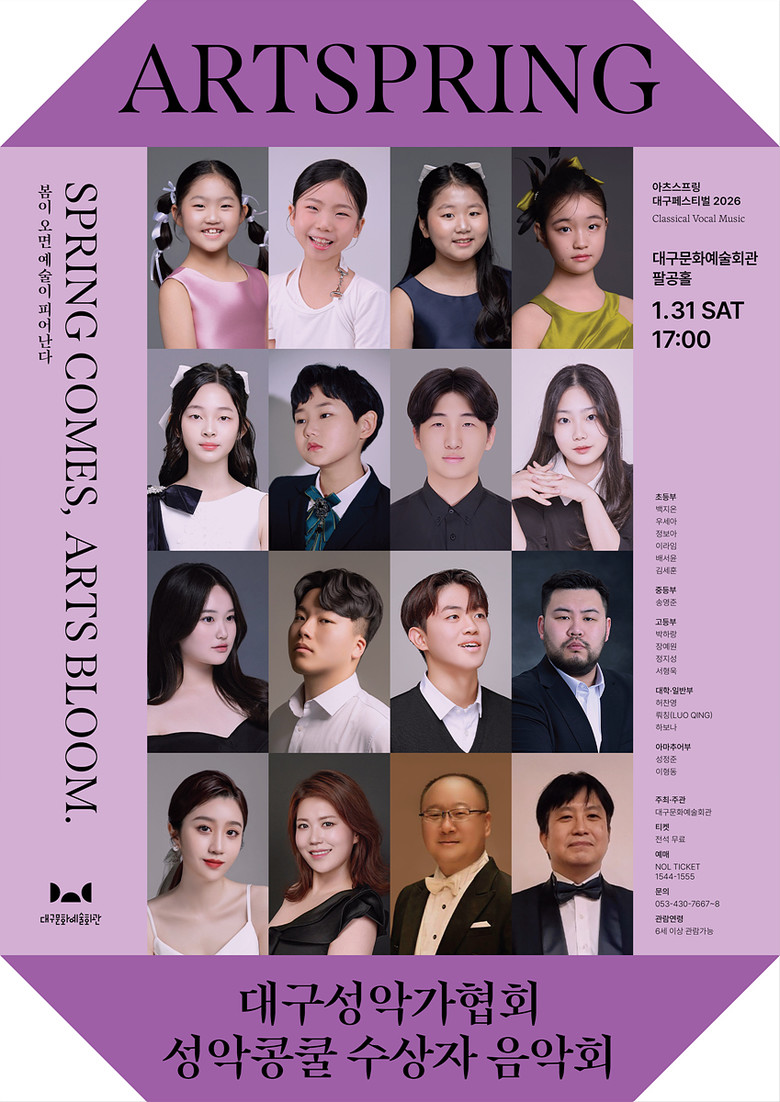 김희철 대구문화예술회관 관장은 “2026 아츠스프링 대구 페스티벌의 시작을 알리는 이번 공연은 지역 성악 인재들의 성장 과정과 가능성을 시민과 함께 나누는 뜻깊은 자리”라며 “ 앞으로도 지역 예술인이 안정적으로 성장할 수 있도록 지원하고 시민이 일상 속에서 예술을 자연스럽게 만날 수 있는 환경을 만들어 가겠다”고 말했다.