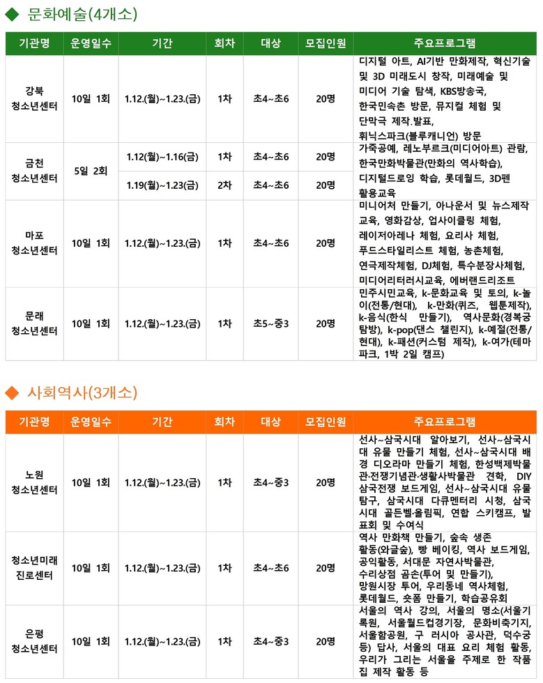 한편, 서울시는 참가 청소년들의 안전을 최우선으로 확보하기 위해 캠프 기간, 타 지역 이동이나 숙박형 프로그램 진행 시 보험 가입 및 수련활동 신고 등 관리 체계를 강화했다.