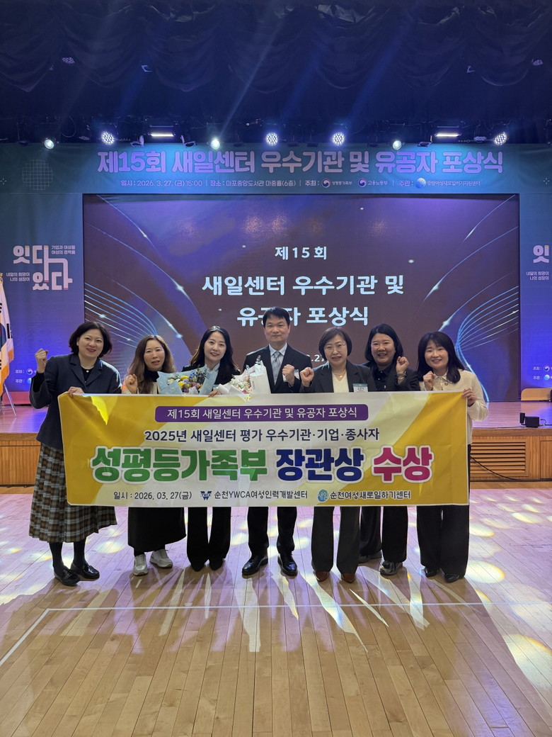 [순천시 세계타임즈=우덕현 기자] 순천시는 지난 27일 서울 마포구에서 열린 ‘제15회 새일센터 우수기관 및 유공자 포상식’에서 순천YWCA여성인력개발센터(관장 김현미)의 여성새로일하기센터(이하 ‘여성새일센터’)가 2025년 전국 새일센터 평가에서 상위 10%인 A등급 우수기관으로 선정되며, ‘성평등가족부 장관상’을 수상했다고 밝혔다.
