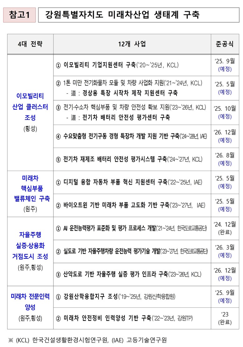 한편, 강원특별자치도는 미래차 산업 생태계 육성을 위해 4개 분야 12개의 연구ㆍ실증 지원 인프라 국가전략사업을 확보하여 원주ㆍ횡성을 중심으로 집적화 단지를 구축하고 있다.