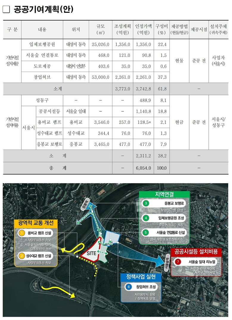 특히, 공공시설 설치비용 약 2,300억 원을 활용하여 지역의 오랜 숙원이었던 ▴동부간선도로 용비교 램프 신설 ▴성수대교 북단 램프 신설 ▴응봉교 보행교 신설 등 지역 여건 개선에 폭넓게 활용할 예정이다.