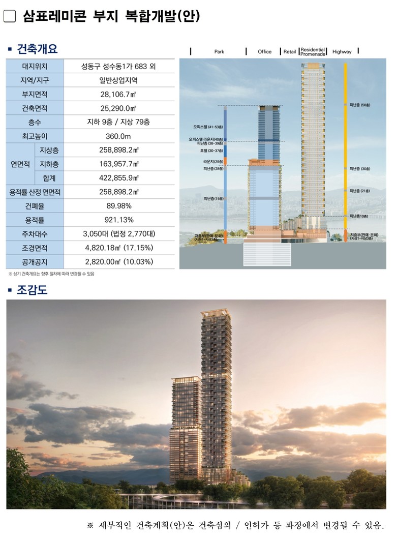 또 서울숲과 부지를 연결하는 ‘입체 보행데크’가 설치되고, 지상부에는 시민에게 상시 개방되는 대규모 녹지와 광장이 들어서 서울숲의 녹지축이 부지까지 확장되게끔 조성된다.