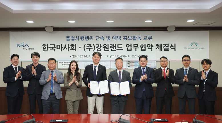 [세계타임즈 = 송민수 기자] 한국마사회(회장 정기환)와 강원랜드(사장 직무대행 최철규)는 지난 18일 경기도 과천시 마사회 본관에서 송대영 마사회 경마본부장과 이광훈 강원랜드 카지노본부장 등 양 기관 관계자들이 참석하여 '불법 사행행위 단속 및 예방·홍보활동 교류' 업무협약(MOU)을 체결했다.