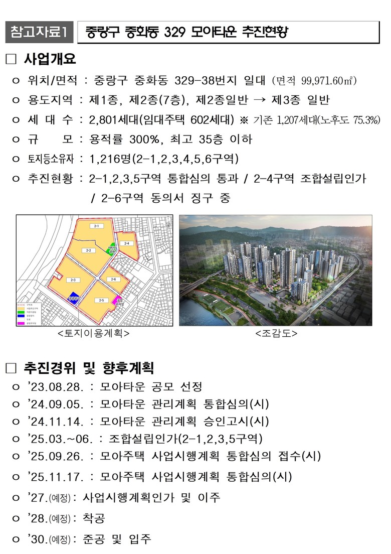 중랑구는 서울시가 추진 중인 모아타운 116곳 중 16곳(2만 3,845호)이 위치한 서울 전체에서 모아타운이 가장 집중된 지역으로 ‘26 ~ ‘31년 기간중 착공 1만 호를 목표로 하고 있다. 시는 중화동 329 모아타운이 선도 사례로 삼아 강북지역 주택공급에 활력을 불어넣는다는 계획이다.