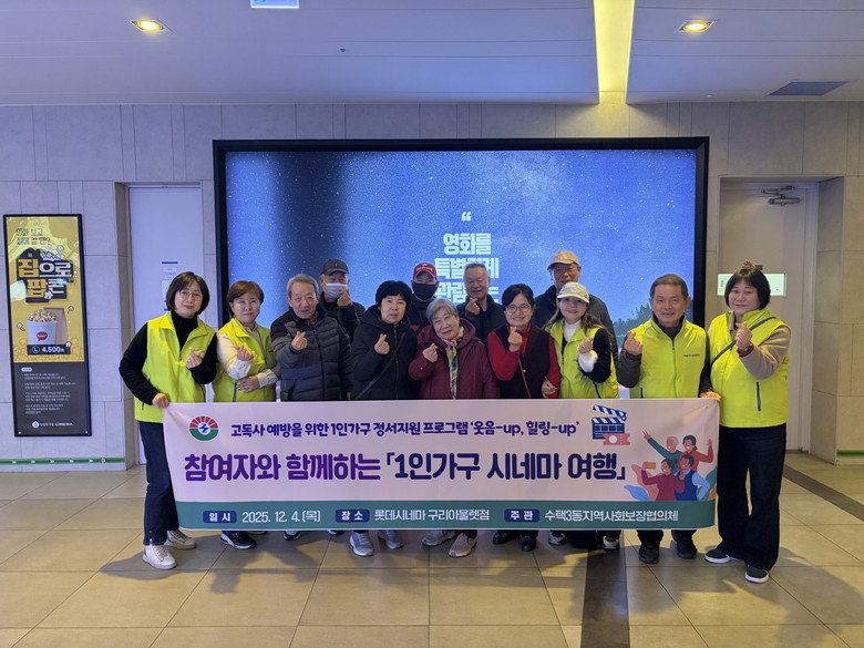 수택3동지역사회보장협의체는 경기사회복지공동모금회 배분금을 지원받아 고독사 예방을 위한 1인 가구 정서 지원 프로그램 ‘웃음-up!, 힐링-up!’을 추진하고 있으며, 이번 영화관람 활동은 문화 체험 행사의 하나로 마련되었다. 참여자들은 함께 신규 개봉영화를 관람하며 여가 문화를 나누는 시간을 가졌다.