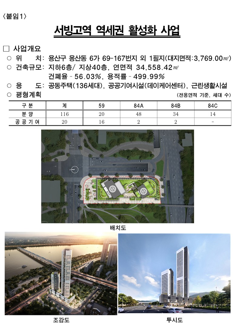 ① 서빙고역 역세권활성화: 한강 조망·돌봄시설 갖춘 생활밀착형 주거복합 136세대 공급