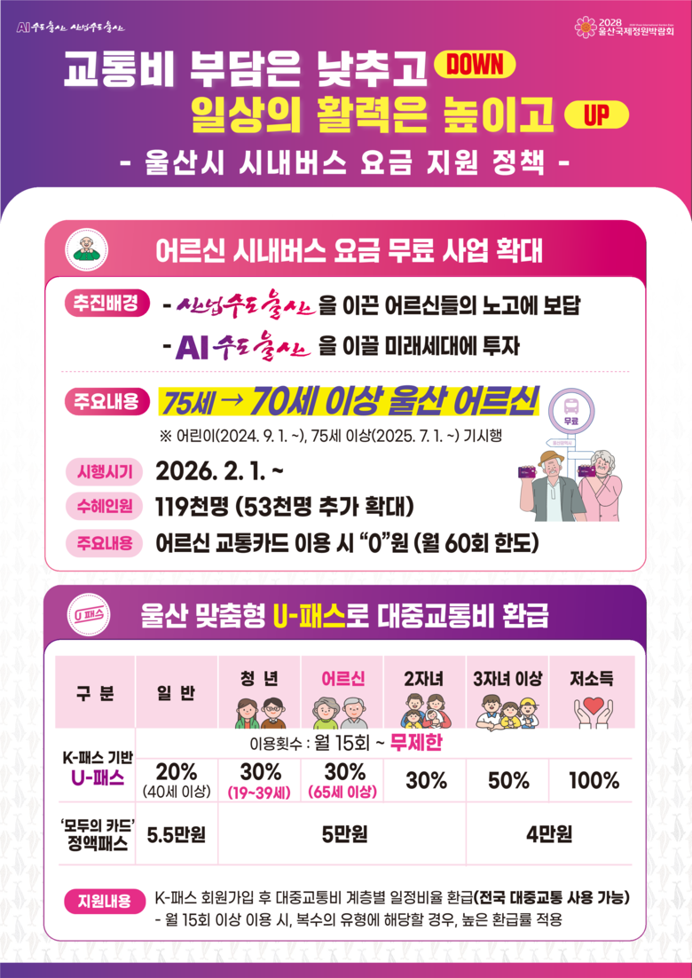 먼저 울산시는 민선 8기 후반기 역점 시책인 ‘울부심 생활+ 사업’의 일환으로, 오는 2월 1일부터 어르신 시내버스 요금 무료 사업 대상을 기존 75세에서 70세 이상으로 확대 시행한다. 이는 대한민국 산업 심장인 산업수도 울산을 만드신 어르신들을 예우하고 고령층의 이동권을 보장하고자 마련하였다.