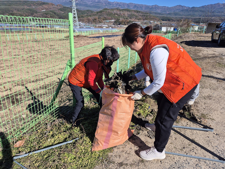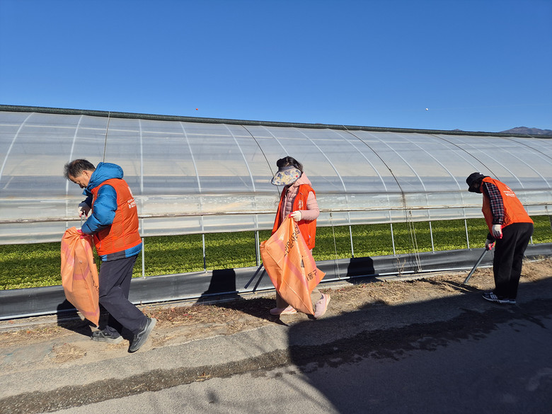 이날 활동에는 회원 70명이 참여해 마을 주변과 동화천 일대에 방치된 영농 폐비닐과 각종 폐기물을 수거하며 농촌 환경 개선에 힘을 보탰다.