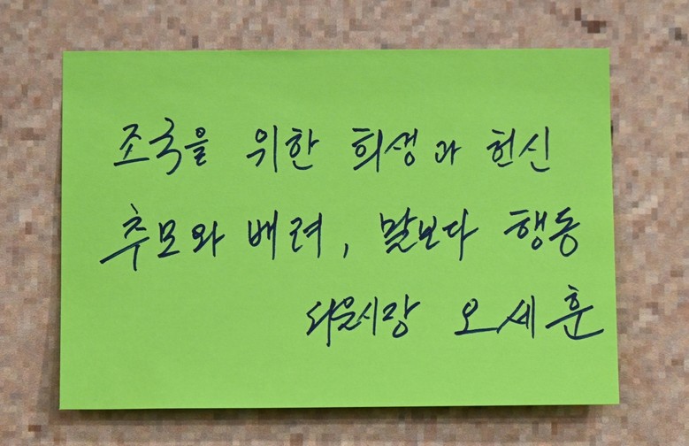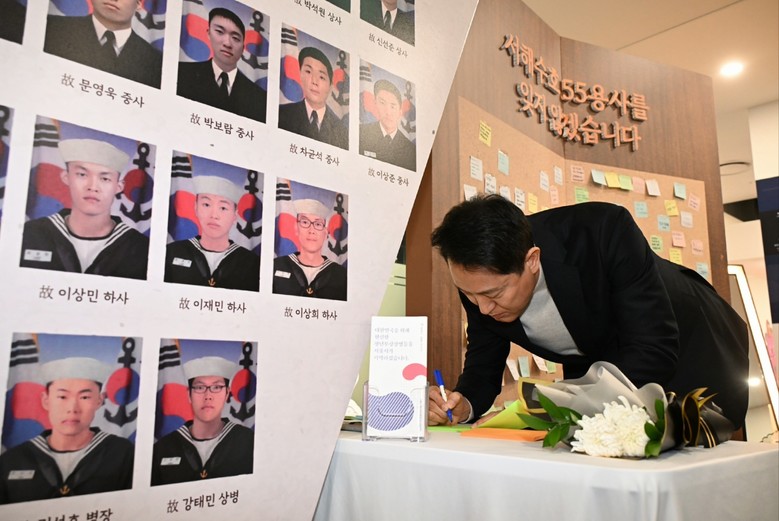앞서 오 시장은 이날 오전 9시 30분, 서울시청 서울갤러리 내에 조성된 ‘서해수호 55용사 추모공간’을 방문해 국가를 위해 산화한 장병들을 추모하고 ‘조국을 위한 희생과 헌신, 추모와 배려, 말보다 행동’이라고 남겼다.
