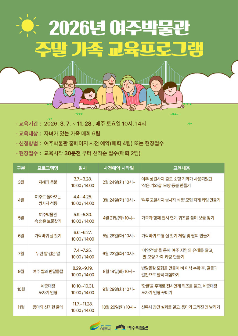 프로그램별 세부내용 확인 및 사전예약 일정은 여주박물관 홈페이지를 참고하거나 전화(031-887-3586)로 문의하면 된다.