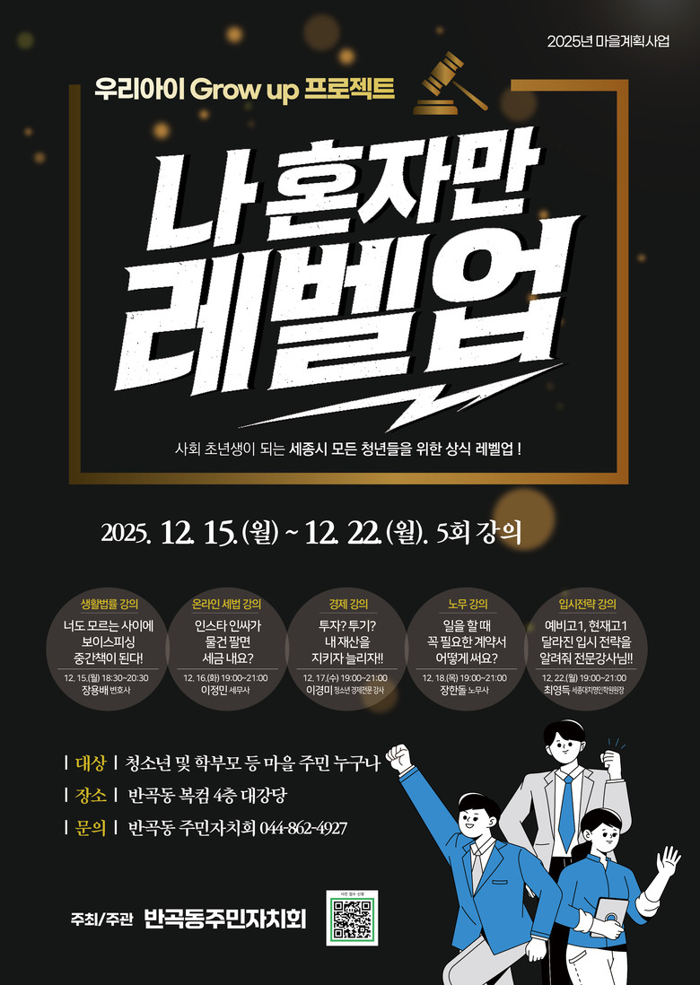 이항선 반곡동 주민자치회장은 “청소년들이 학교에서 배우기 어려운 생활 속 필수 법률 지식 등을 익히며 스스로 성장하는 시간을 가질 수 있을 것”이라며 “앞으로도 마을계획사업을 통해 청소년이 건강하게 성장할 수 있는 교육·문화 프로그램을 발굴하겠다”고 전했다.