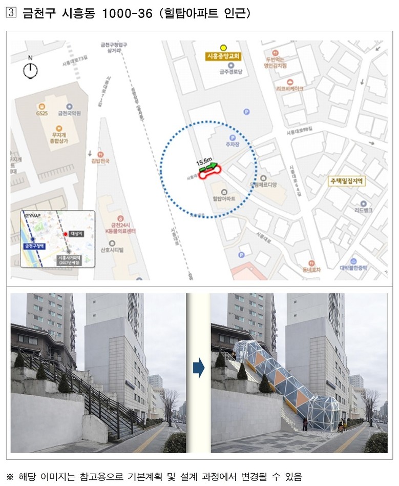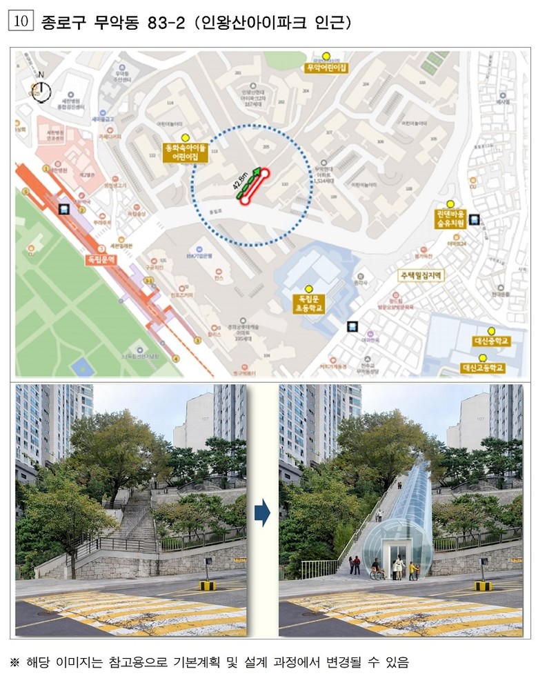 분야별 전문가로 구성된 선정위원회는 접수된 후보지 55곳 가운데 경사도가 30% 이상인 급경사 계단을 중심으로, 이용 수요와 생활 동선 개선 효과가 큰 지역을 검토해 10곳을 선정했다.